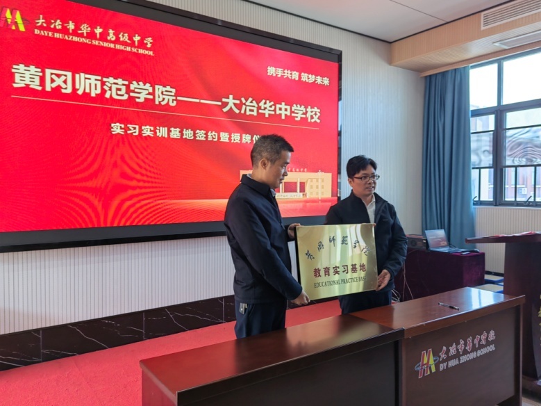 10月28日上午,我校“教育实习基地”签约挂牌仪式在大冶市华中高级中学举行。文学院(苏东坡书院)副院长何荣誉,华中高中校长明强,以及文学院潘志刚副教授、华中高中校长助理、学科骨干教师等出席签约、挂牌仪式。