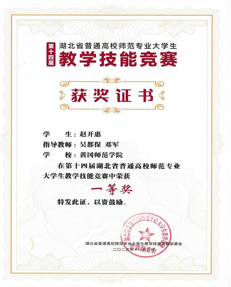 11月8日,第十四届湖北省普通高校师范专业大学生教学技能竞赛现场总决赛在华中师范大学落下帷幕。在吴都保、邓军老师的精心指导下,我院文学202204班本科生赵开慧荣获一等奖。