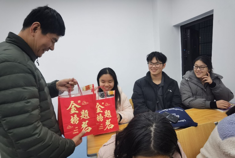 紧接着,最暖心的环节到来。出席活动的领导、老师亲自将精心准备的“考研助力大礼包”逐一送到每位考研学子手中。这份礼包不仅包含了实用的考试文具与暖心的补给品,更特别装载了来自学院领导、班主任老师、学弟学妹以及各社团同学们亲手书写的一份份祝福卡片。卡片上或笔力遒劲,或字迹娟秀,字里行间充满了“一‘研’为定”、“心想事成”、“学长学姐加油”等真诚的鼓励与美好的期盼,让在场学子倍感温暖与鼓舞。