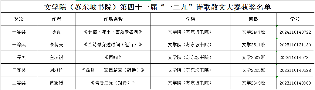 近日,湖北省高校第四十一届“一二·九”诗歌散文大赛圆满落幕,我院学子获一等奖2项、二等奖1项,三等奖2项,创历史最好成绩。